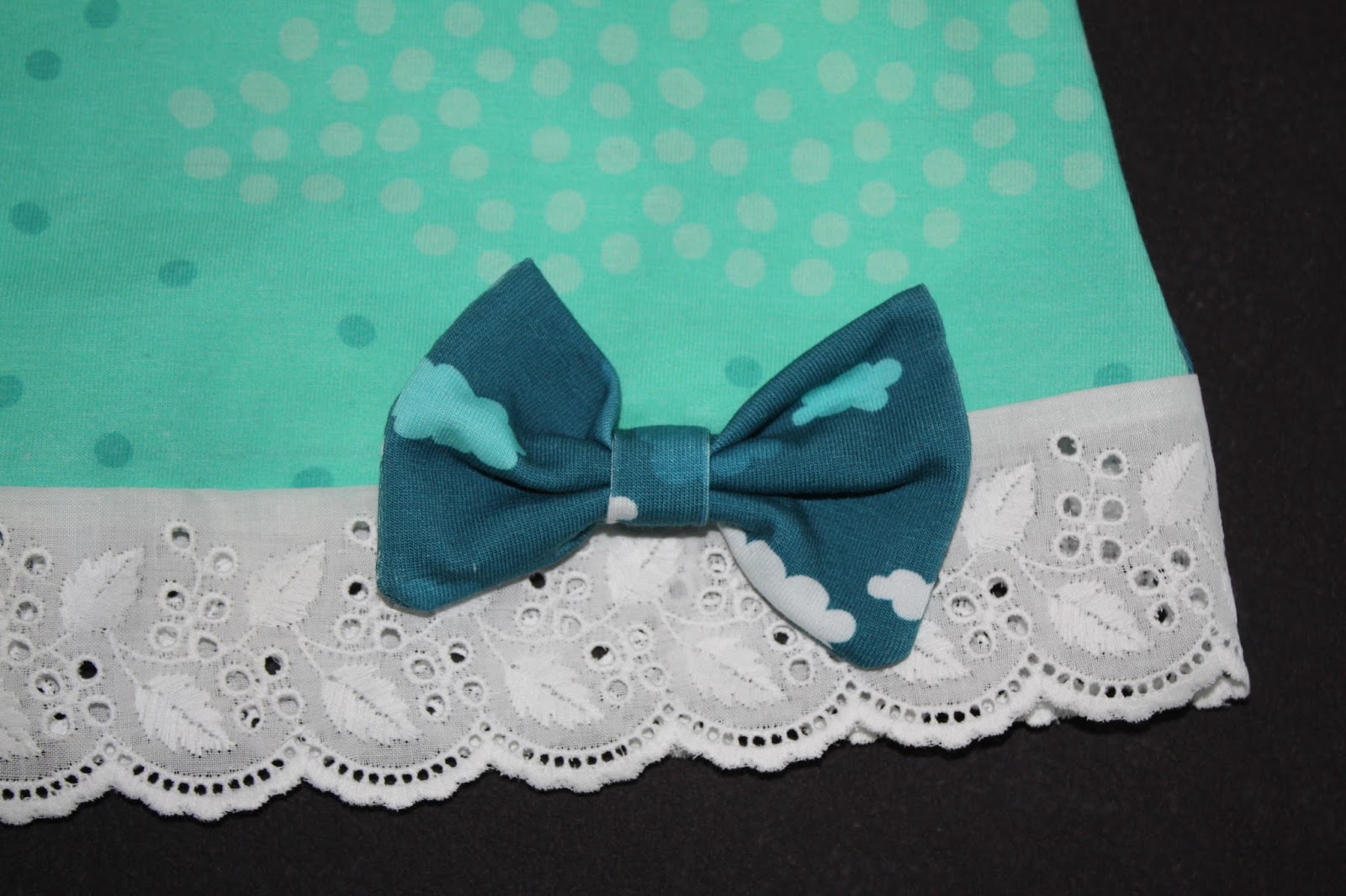 Zum ersten Mal habe ich mich an einer Schleife versucht und finde sie total niedlich. (Nachtrag: Die Schleife habe ich nach der Anleitung vom Mama Nähblog genäht. Ich habe auch die im Beispiel angegebenen Maße von 10 cm x 13 cm und 3 cm x 10 cm beibehalten.)
