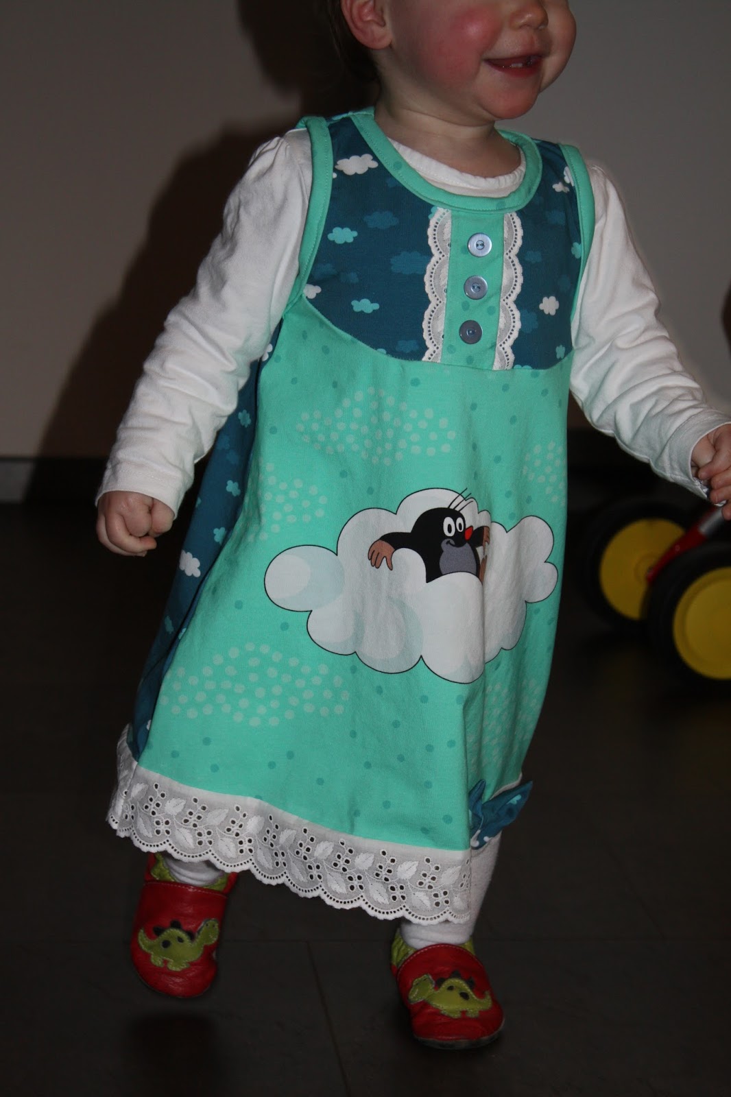 Nachdem das Trägerkleid aus dem Heidi-Panel bereits jetzt zu meinen Lieblingskleidern gehört, musste ich aus dem Pauli-Panel von „Der kleine Maulwurf reist um die Welt“ ebenfalls ein Trägerkleid nähen. Schnell war klar, dass es der Pauli auf der Wolke wird, denn für die anderen beiden Bilder des Panels ist Madita noch zu klein. Der Wolkenstoff wurde von Stoff und Liebe als Kombi dazu angeboten. Für die falsche Knopfleiste sowie die Einfassung an Hals- und Armausschnitten habe ich Reste des Panelbildes verwendet.