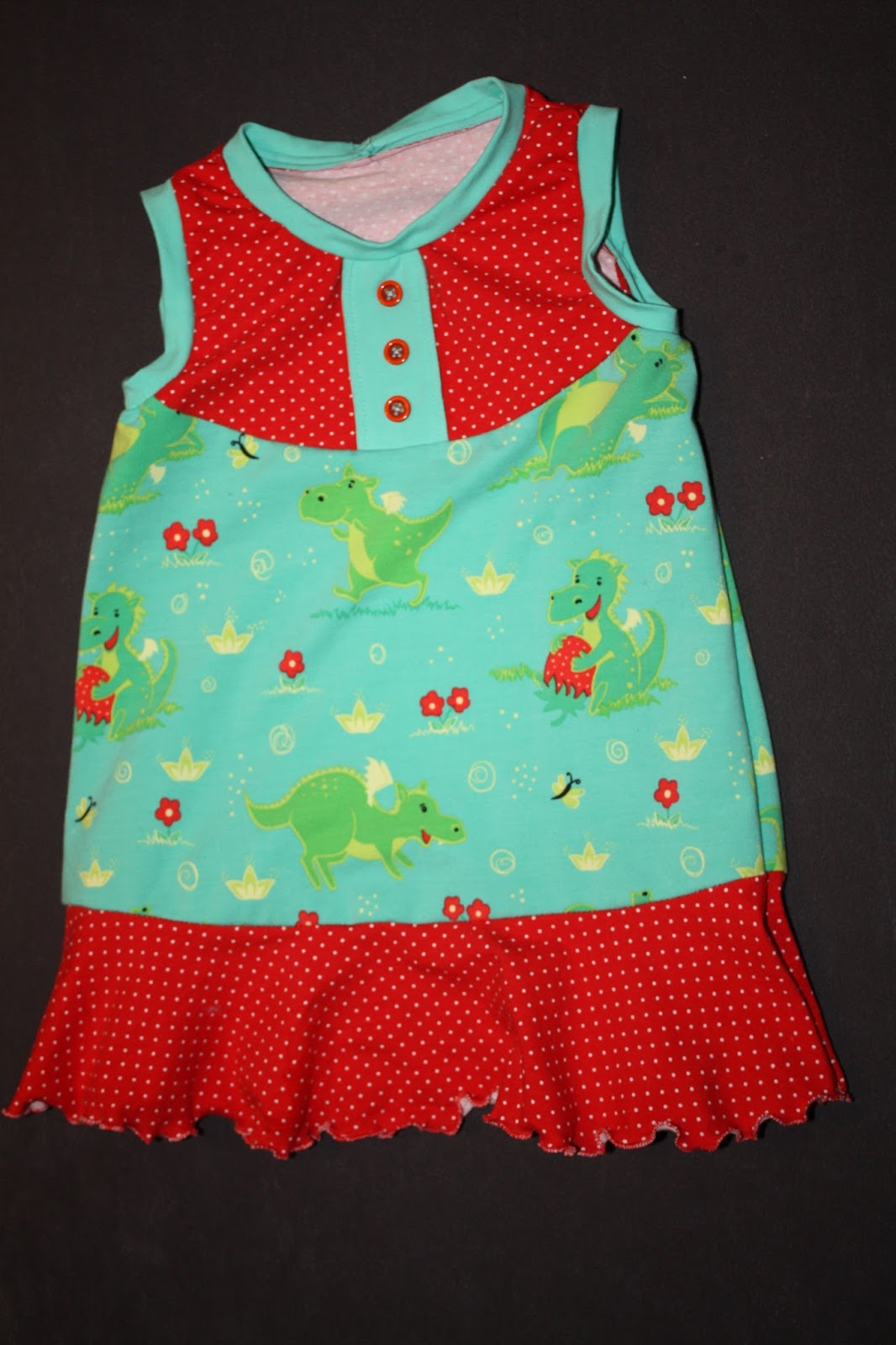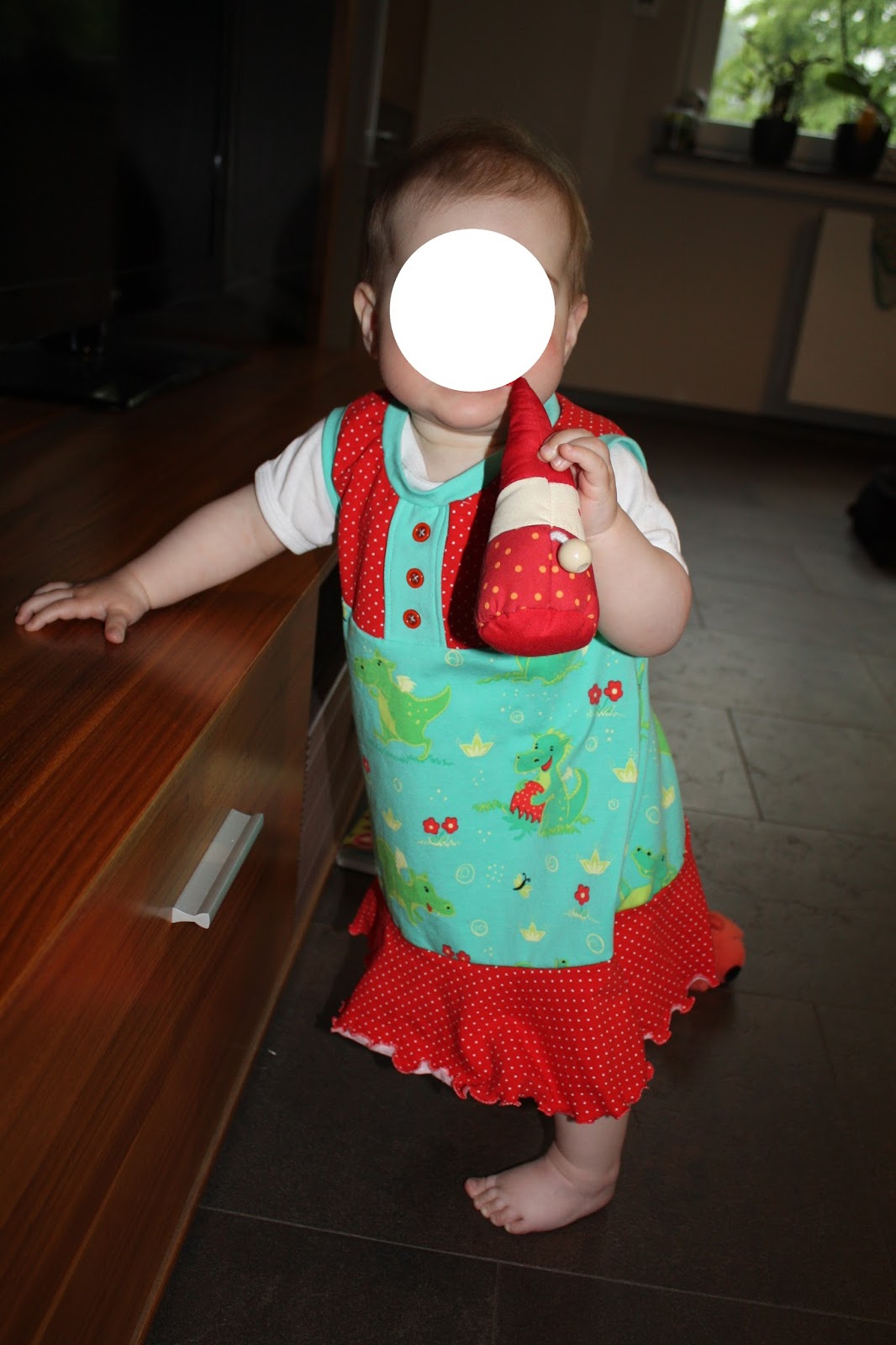 Mein erstes Kleid ist fertig. Ich habe ein Trägerkleid von Klimperklein mit falscher Knopfleiste und Volant genäht.
