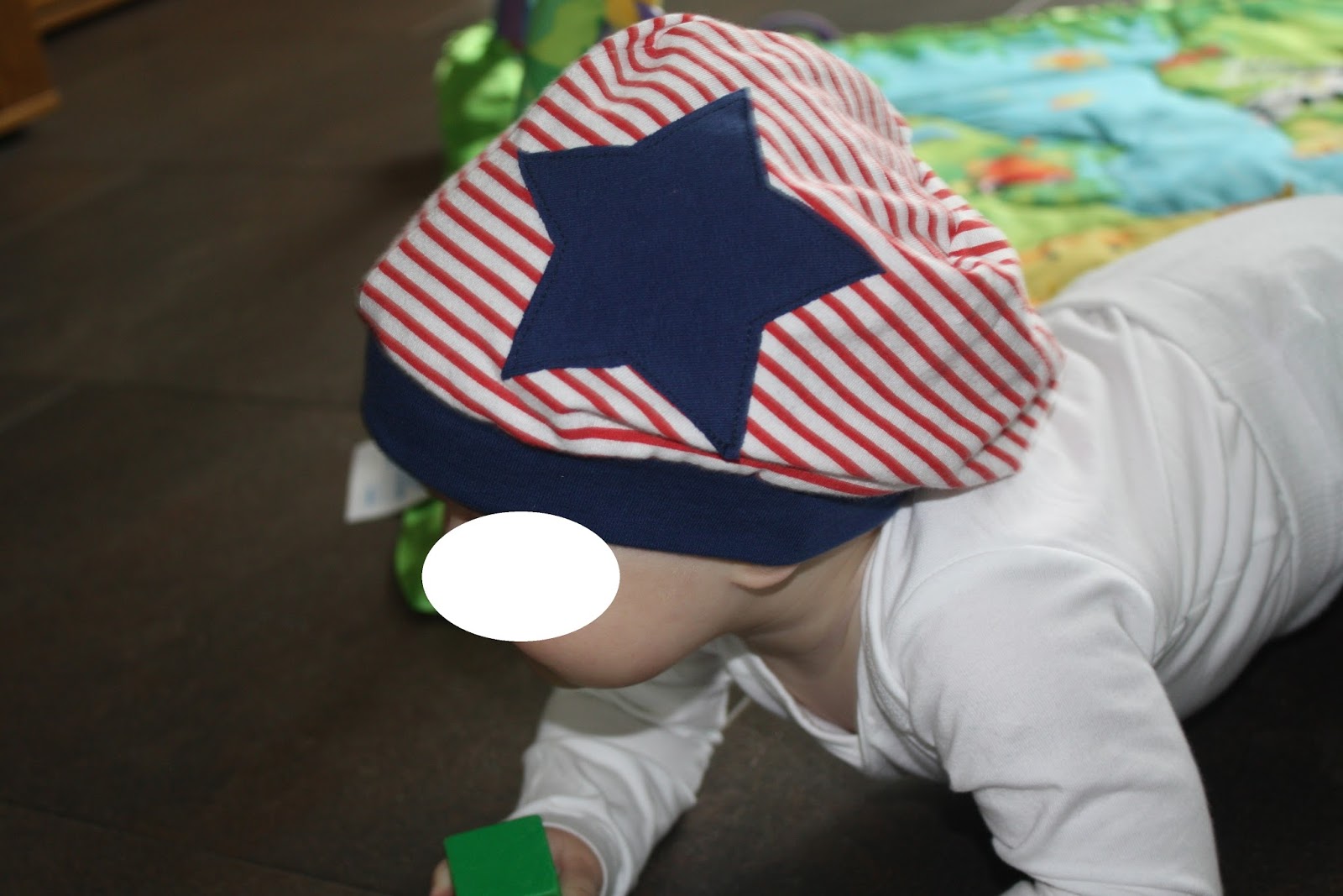Außer der Pumphose hat meine Kollegin noch eine Mütze für ihre Tochter zum ersten Geburtstag bekommen. Das Schnittmuster für die rutschsichere Beanie stammt von Nuckelbox. Ich habe diesen Schnitt schon mehrmals genäht, was ich aber vergessen hab jedes Mal dazu zu schreiben, ich habe sie immer ohne Innenmütze genäht. Und trotzdem finde ich, dass sie durch das Bündchen sehr gut sitzt und nur ganz selten mal rutscht.