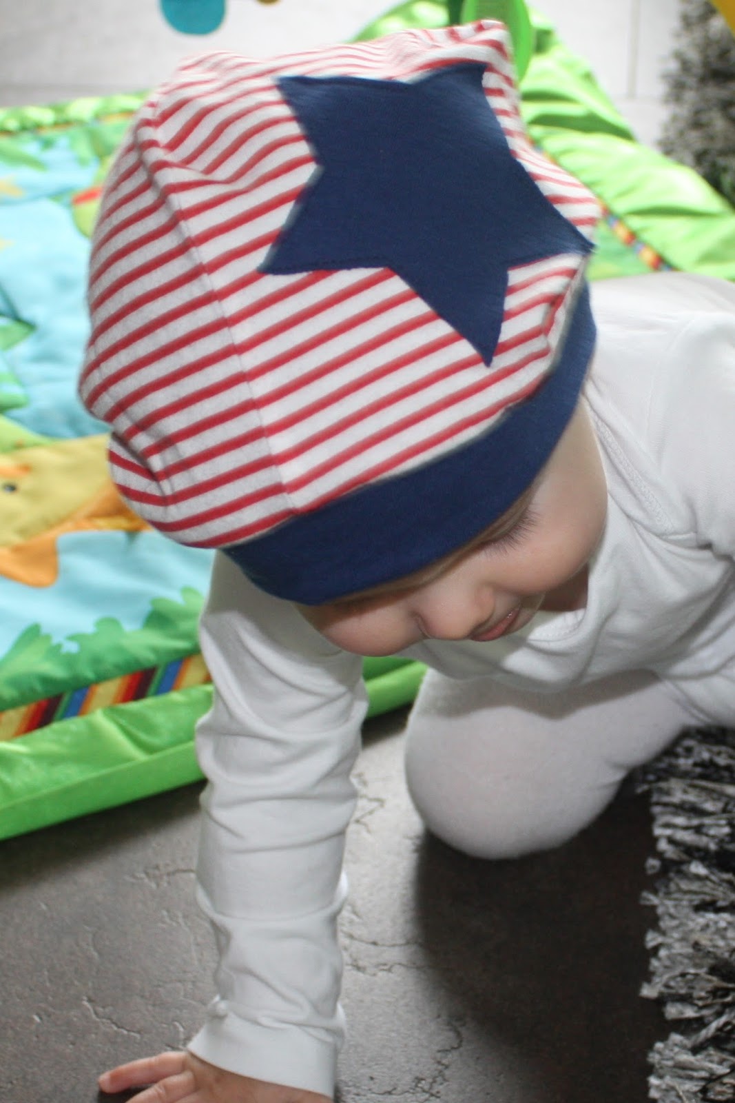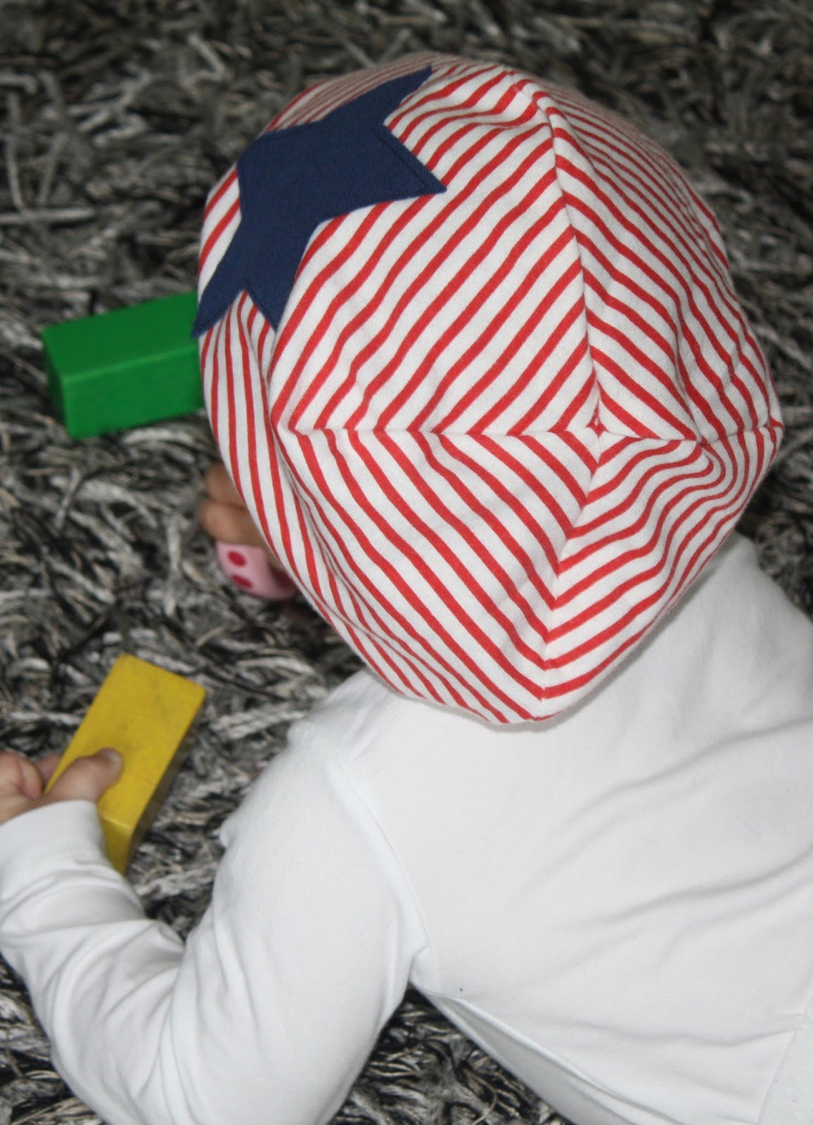 Der rot-weiß gestreifte Stoff war mal ein Shirt von der Cousine meines Mannes. Dazu gab es eine Sternapllikation und ein Bündchen aus dunkelblauen Jersey.