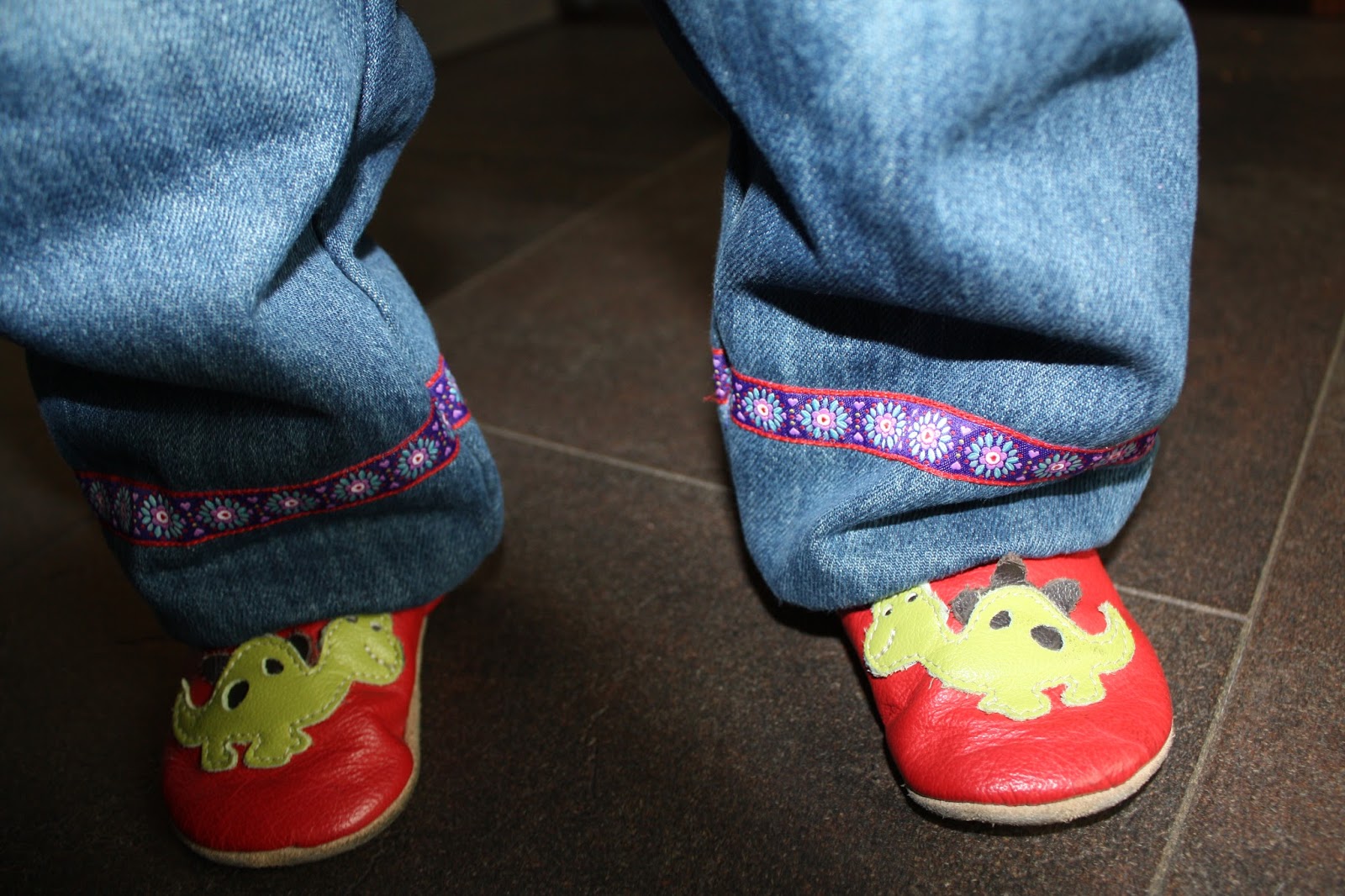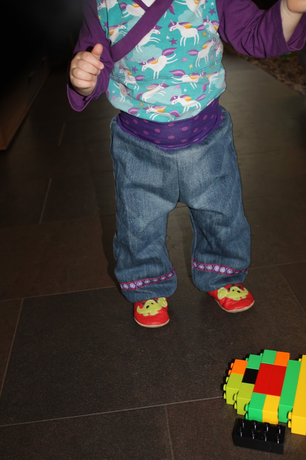 Der Jeansstoff war mal eine alte Hose von mir. Verziert ist die Hose mit Webband und dazu gab es ein Bündchen aus lila Punktejersey, den ich noch als Reststück hatte.