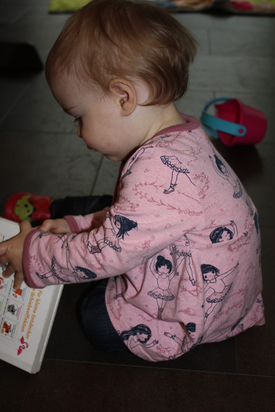 Wie bereits die erste Knopftunika in Größe 80 passt auch diese bereits ganz gut, aber sie lässt auch noch Platz zum Wachsen. Diesmal habe ich die Originallänge der Ärmel beibehalten, im Moment müssen sie daher noch umgeschlagen werden. Mal sehen, was sie hinterher besser bewährt.