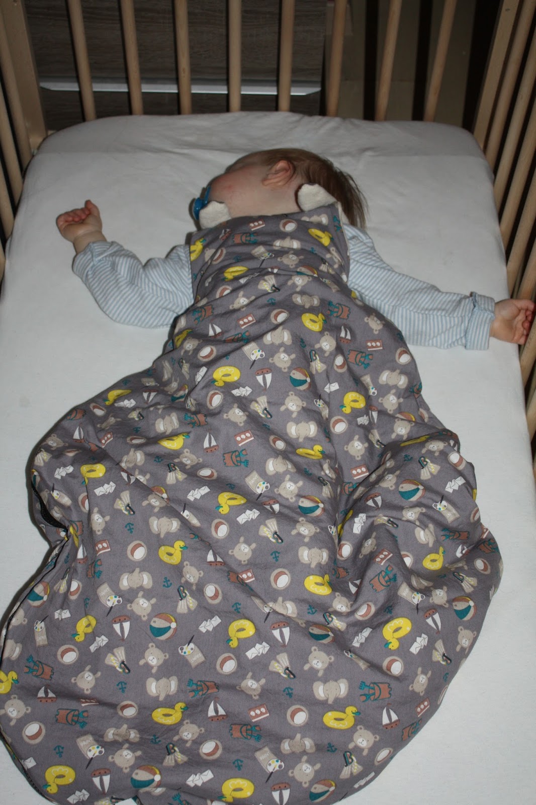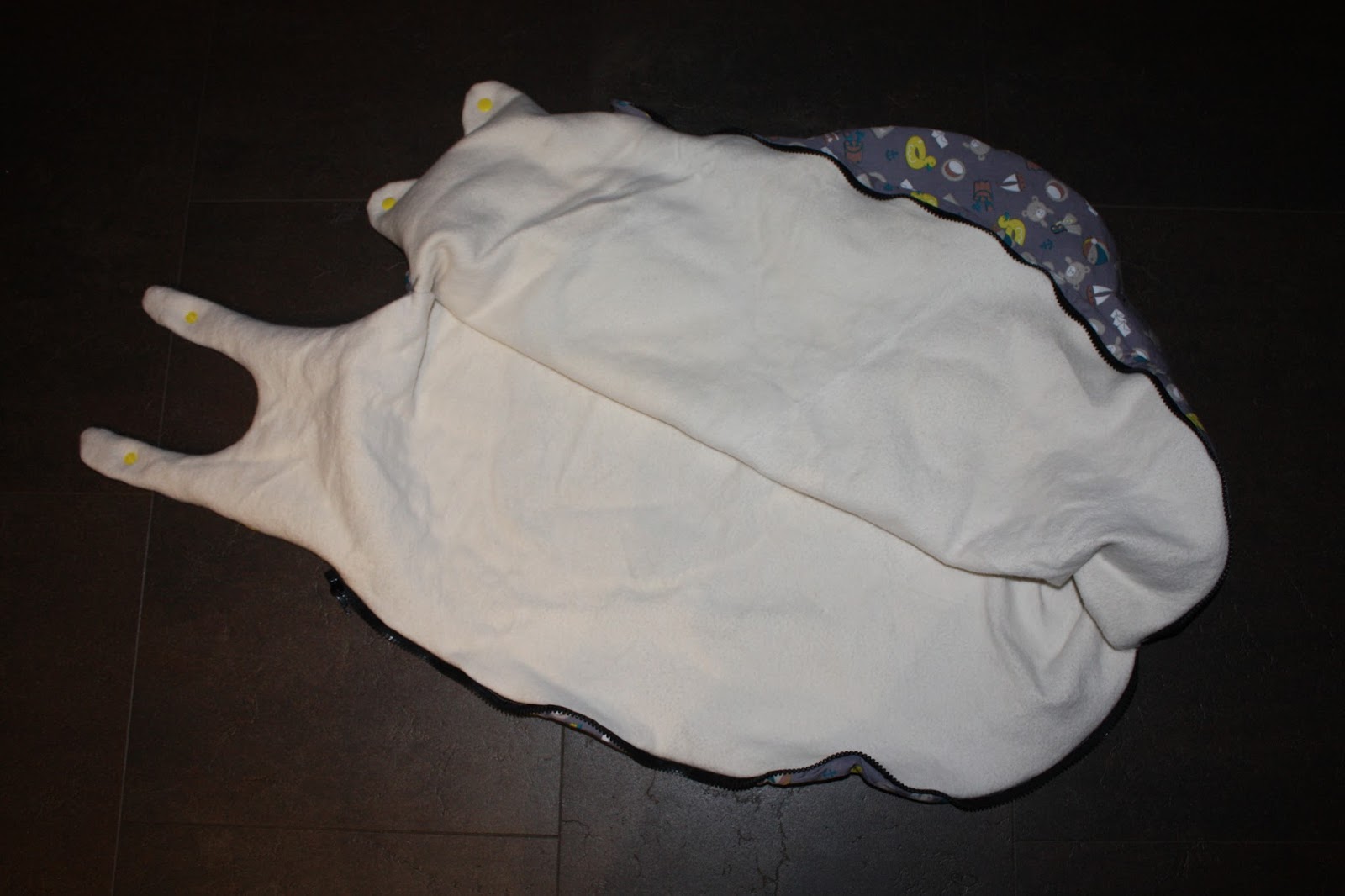 Auch wenn der erste Schnitt noch passt, habe ich das Schnittmuster leicht vergrößert, damit der Schlafsack auch noch Platz zum Wachsen lässt. Schließlich fängt der Winter erst an. Oben rum entspricht er in etwa einer Größe 68/74, aber einer Länge von 90 cm.