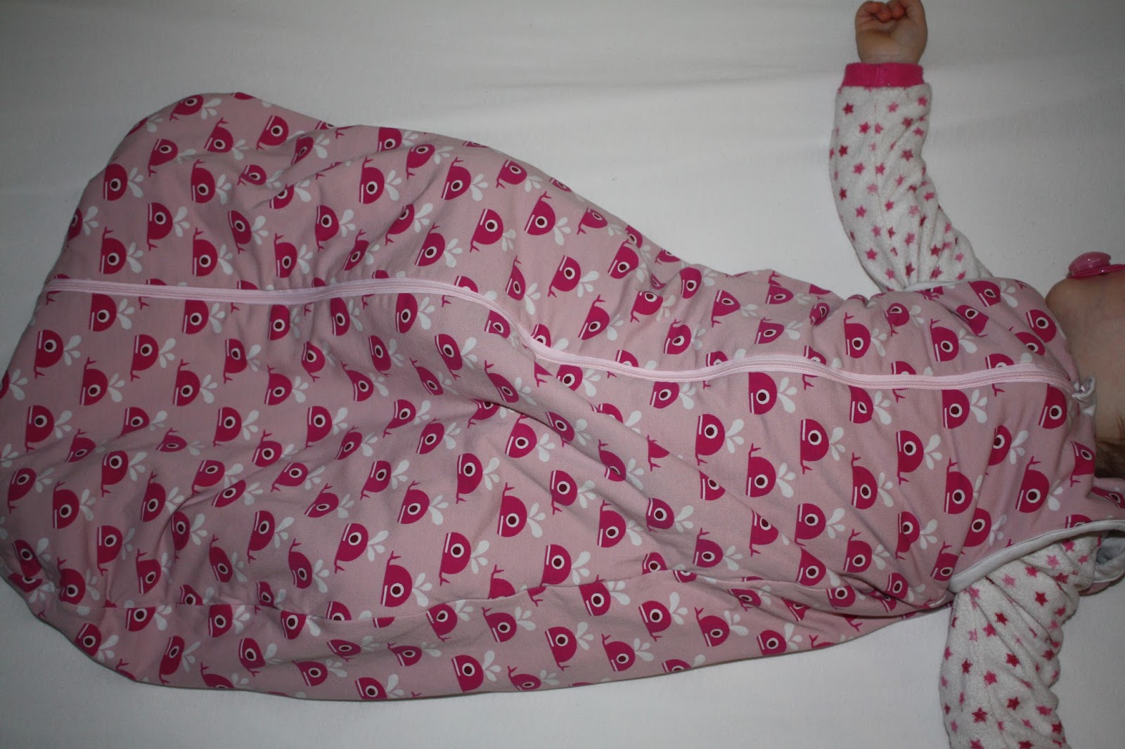 Da der Probeschlafsack am Hals zu weit war, habe diesmal für den Hals- und Armausschnitt noch eine Nummer kleiner Größe 56/62 gewählt. Die Länge von Größe 80/86 habe ich beibehalten. Es ist immer noch viel Stoff vorne und steht auch noch etwas am Hals ab, aber es ist ok und Madita kann ihn tragen.