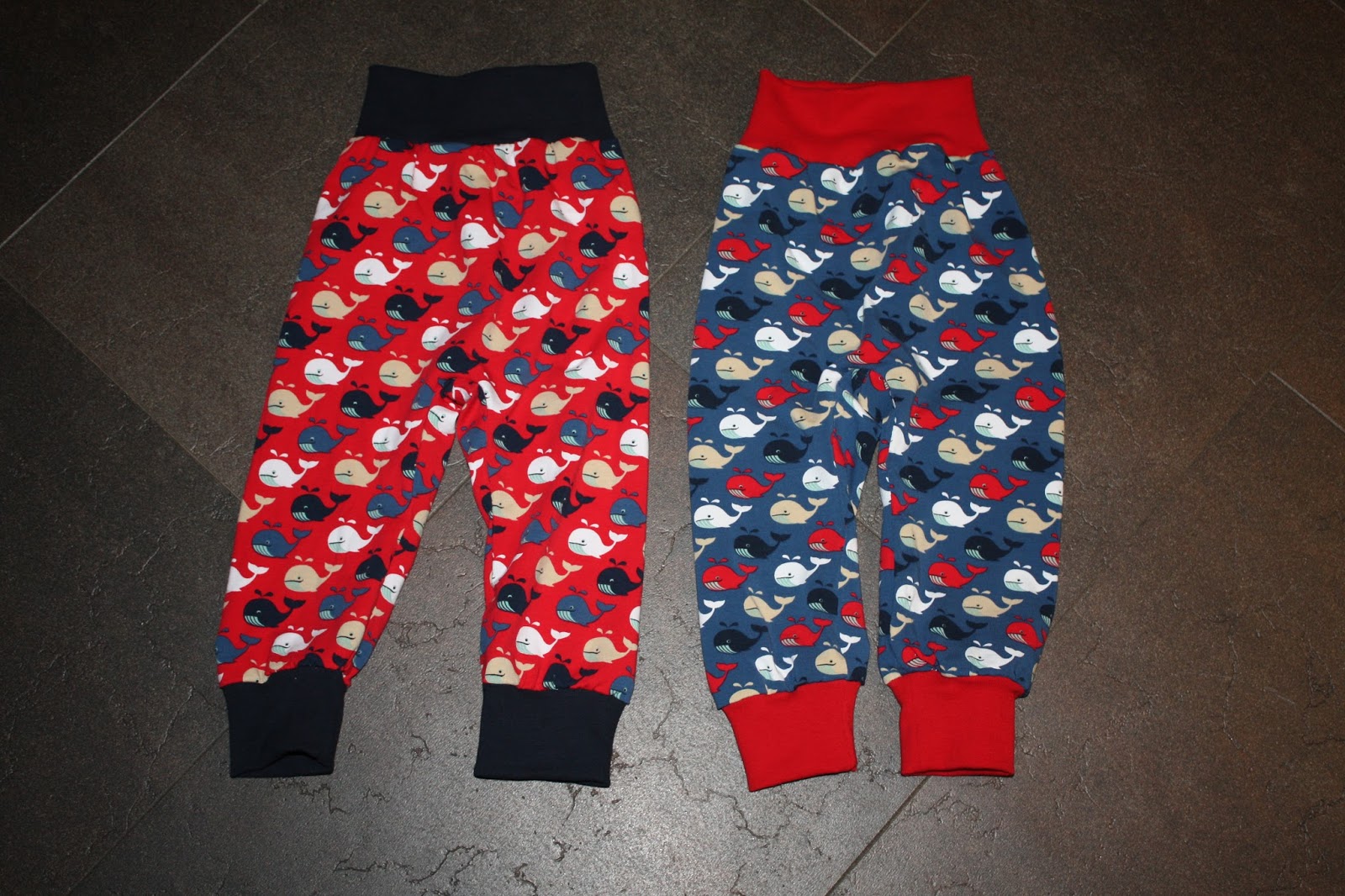 Da die Zwillinge bald ein Jahr alt werden, hab ich beide Hosen in Größe 80 genäht. Eigentlich hatte ich die blaue Hose für den Jungen gedacht und die rote fürs Mädchen, aber es würde natürlich auch umgekehrt gehen.